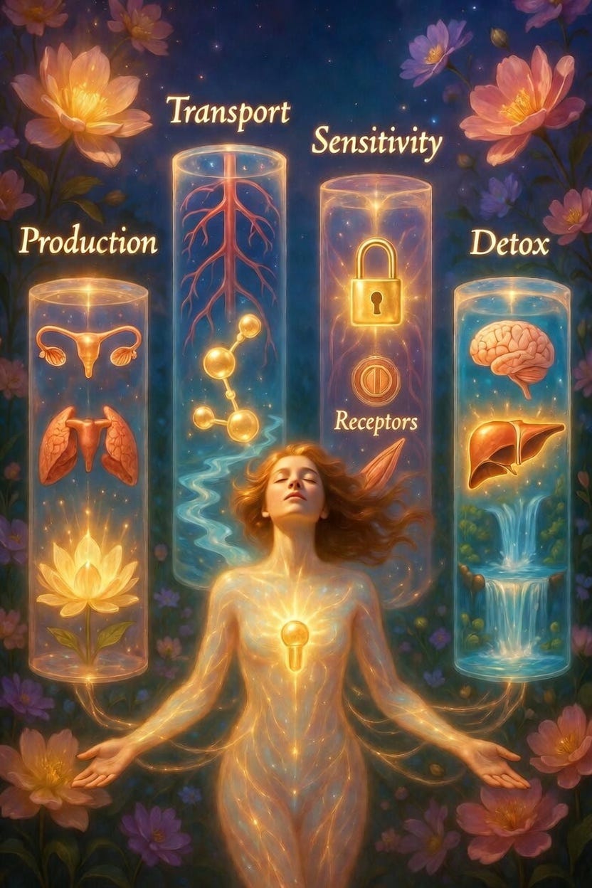 Understanding how testosterone works in women’s bodies is like mapping a river system: it starts from hidden sources, travels through currents, interacts with the landscape, and eventually flows back into the ecosystem. Let’s break it down into four key pillars—production, transport, sensitivity, and detoxification—to see why balance matters and how disruptions can affect daily life.